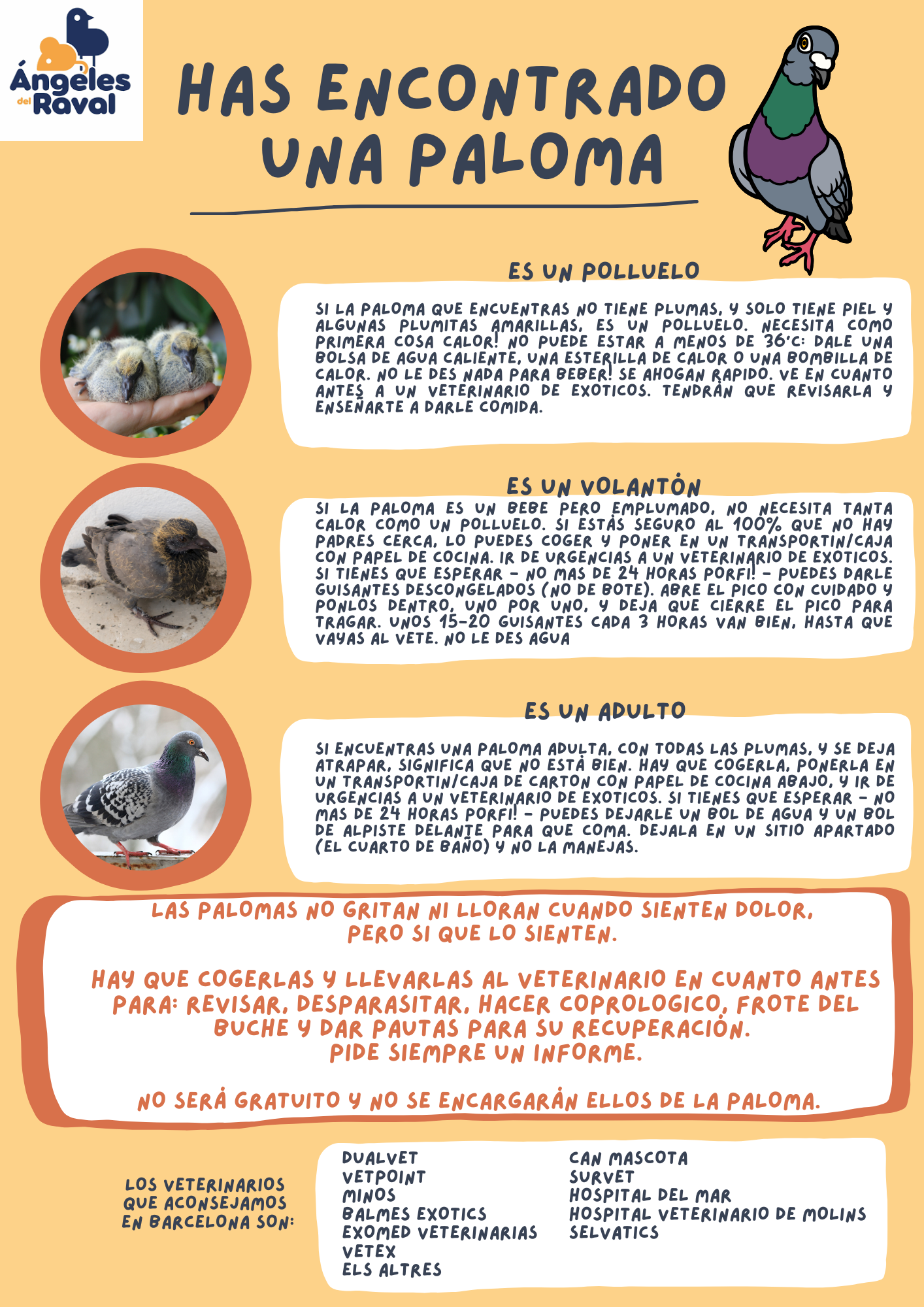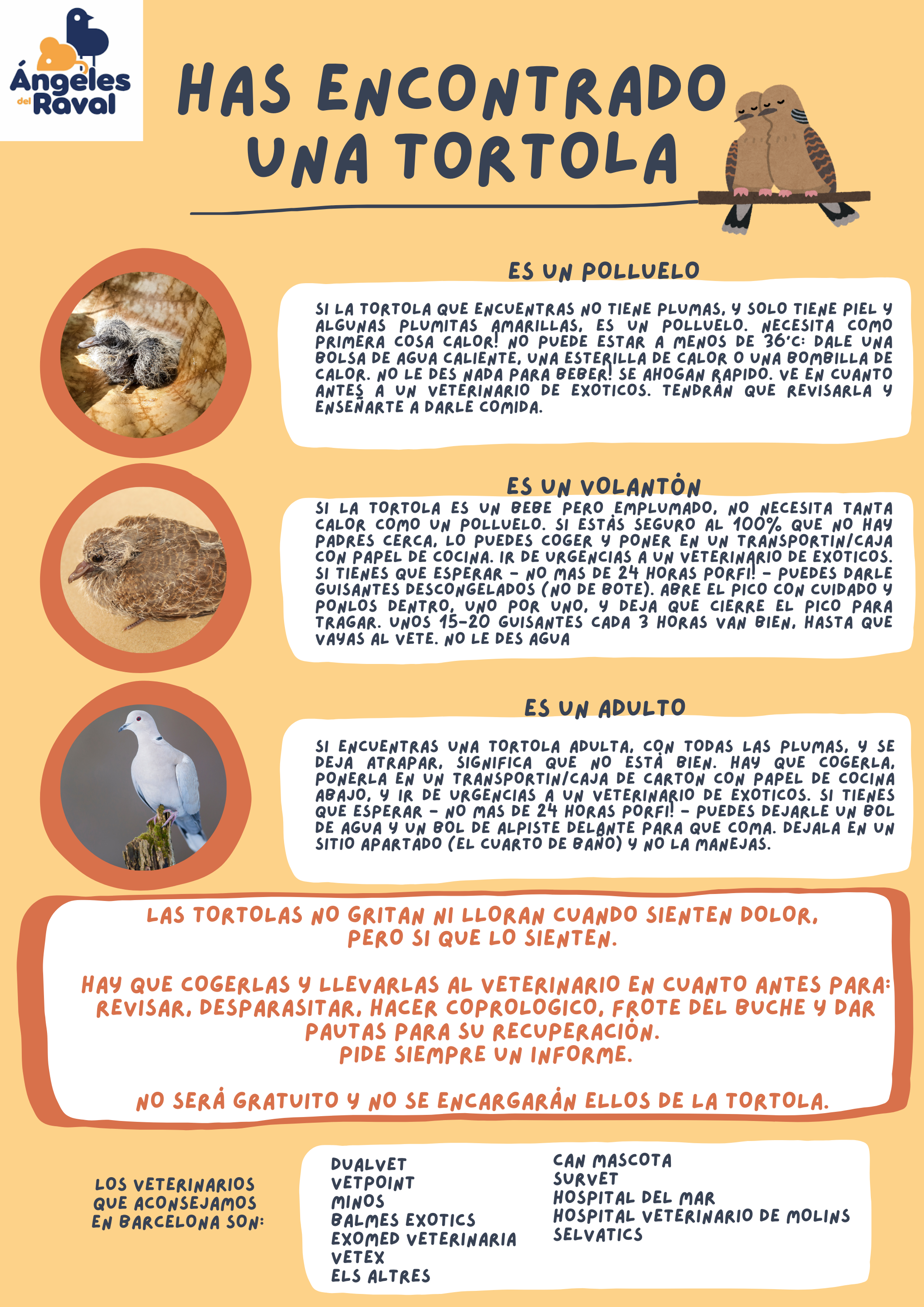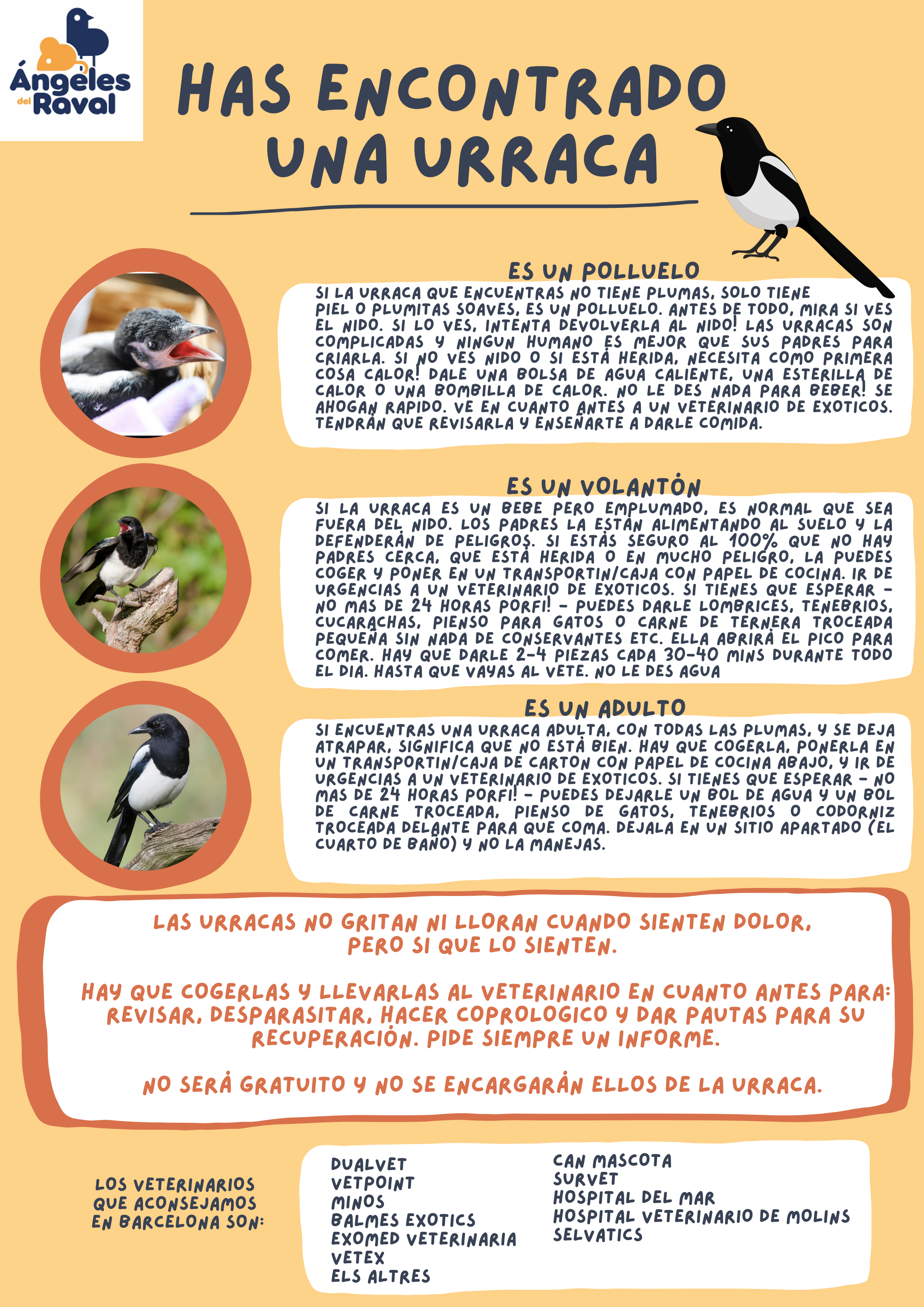 – Si es una paloma, tórtola o urraca, lee las hojas de info aquí abajo. Ten en mente que sin informe veterinario NO nos vamos a encargar, que tu tendrás que pagar la visita veterinaria y te podemos confirmar que podemos encargarnos solamente DESPUÉS de ver el informe.